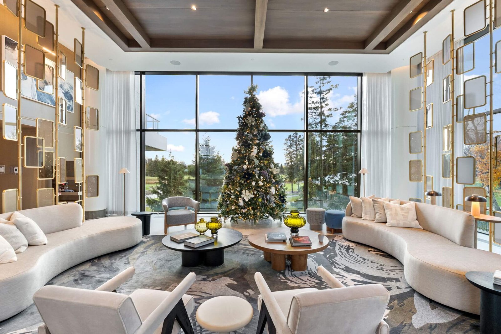 Every element has been carefully considered, from light oak flooring and bookmatch porcelain tiles to designer fireplaces and motorized sheer curtains, creating a setting that balances warmth with contemporary sophistication.
